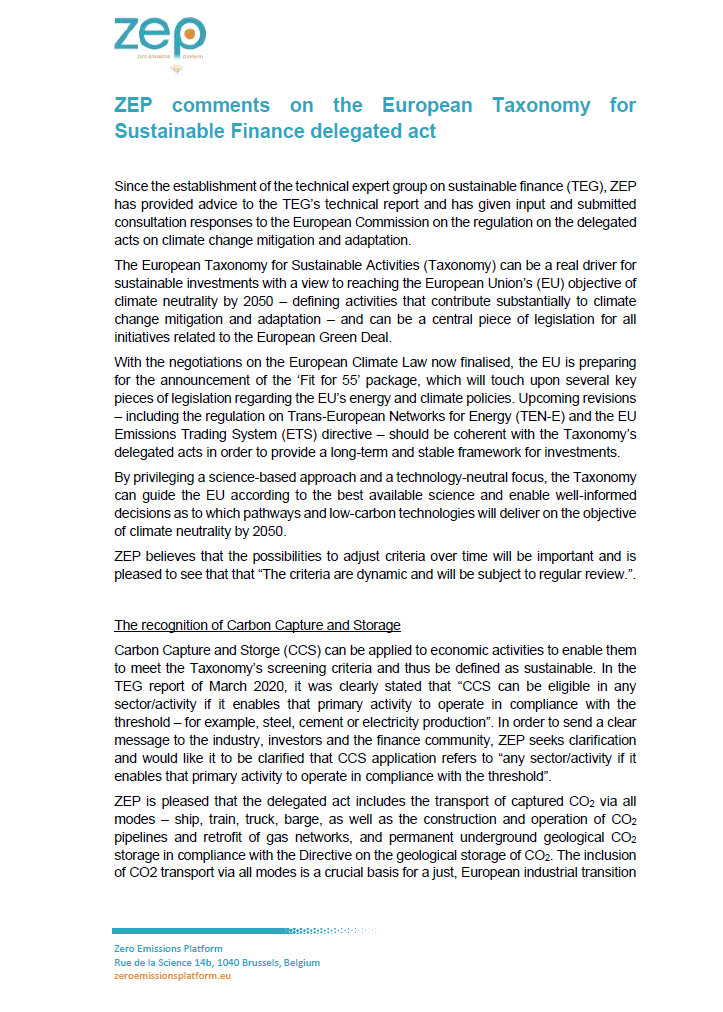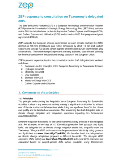 ZEP response to consultation on Taxonomy’s delegated acts
