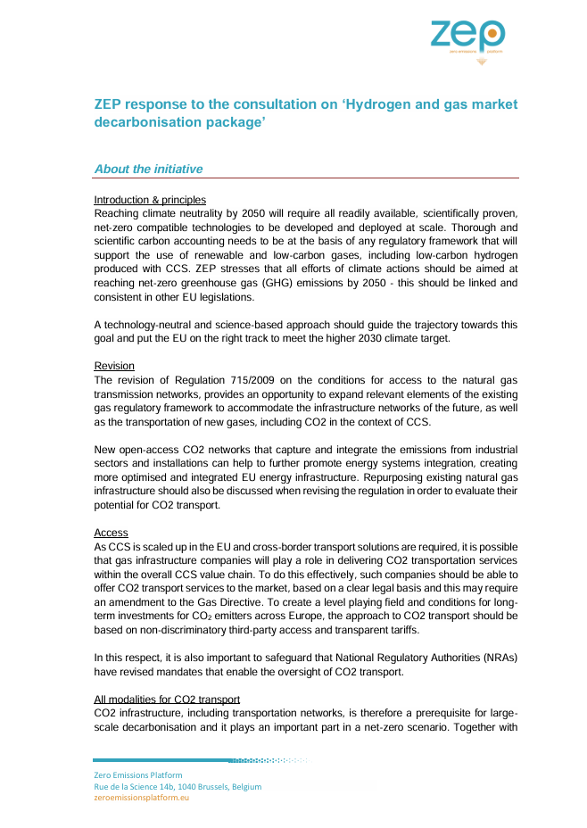 ZEP response to the Inception Impact Assessment (IIA) on ‘Hydrogen and gas market decarbonisation package’
